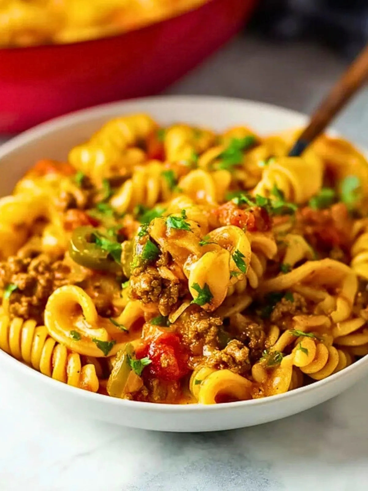 La Pasta Taco Facile En Un Seul Plat marie la générosité d’un plat de pâtes fondant à l’intensité épicée d’une garniture façon tacos. Fromage filant, bœuf parfumé et tomates mijotées s’enrobent autour de pâtes tendres pour créer un repas complet et ultra réconfortant.
