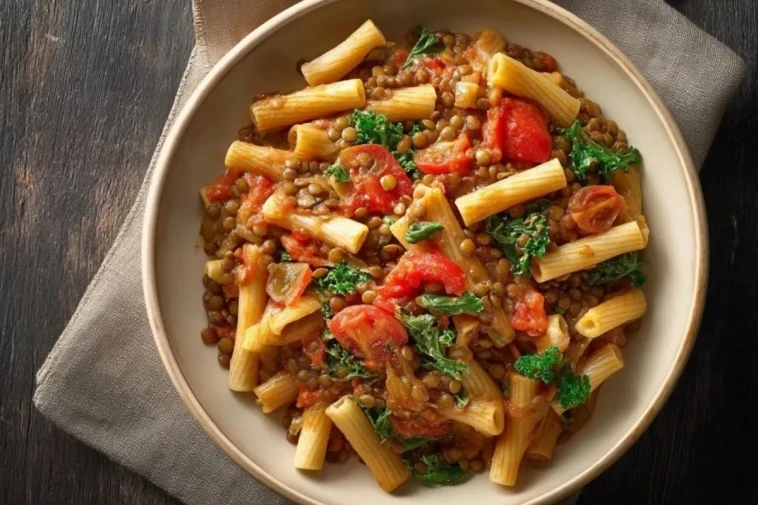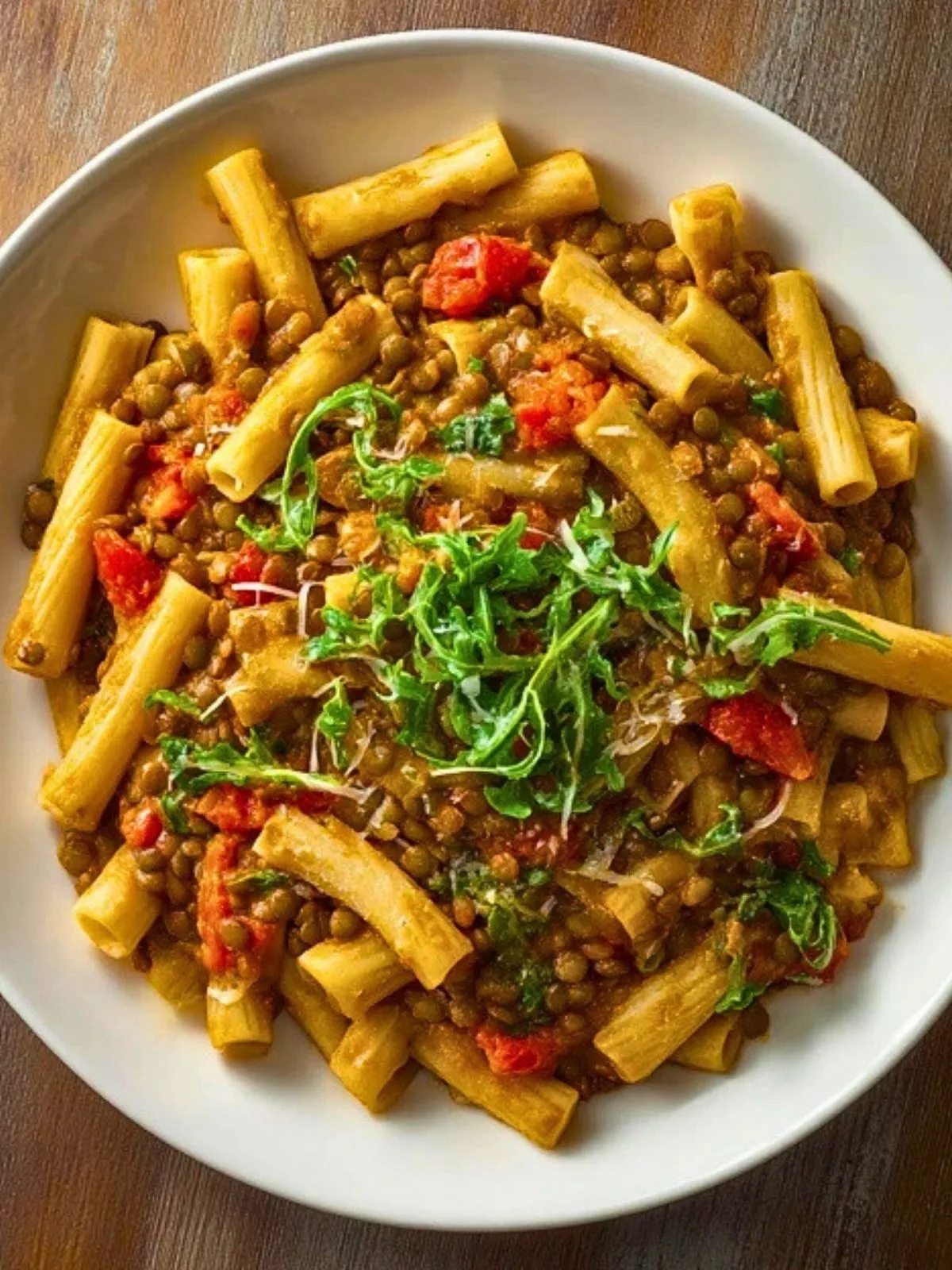 Ces pâtes aux lentilles nutritives marient des rigatoni al dente à un ragoût de lentilles parfumé à la tomate, relevé d’ail, d’oignon et d’herbes, pour un plat complet, réconfortant et naturellement riche en protéines végétales.