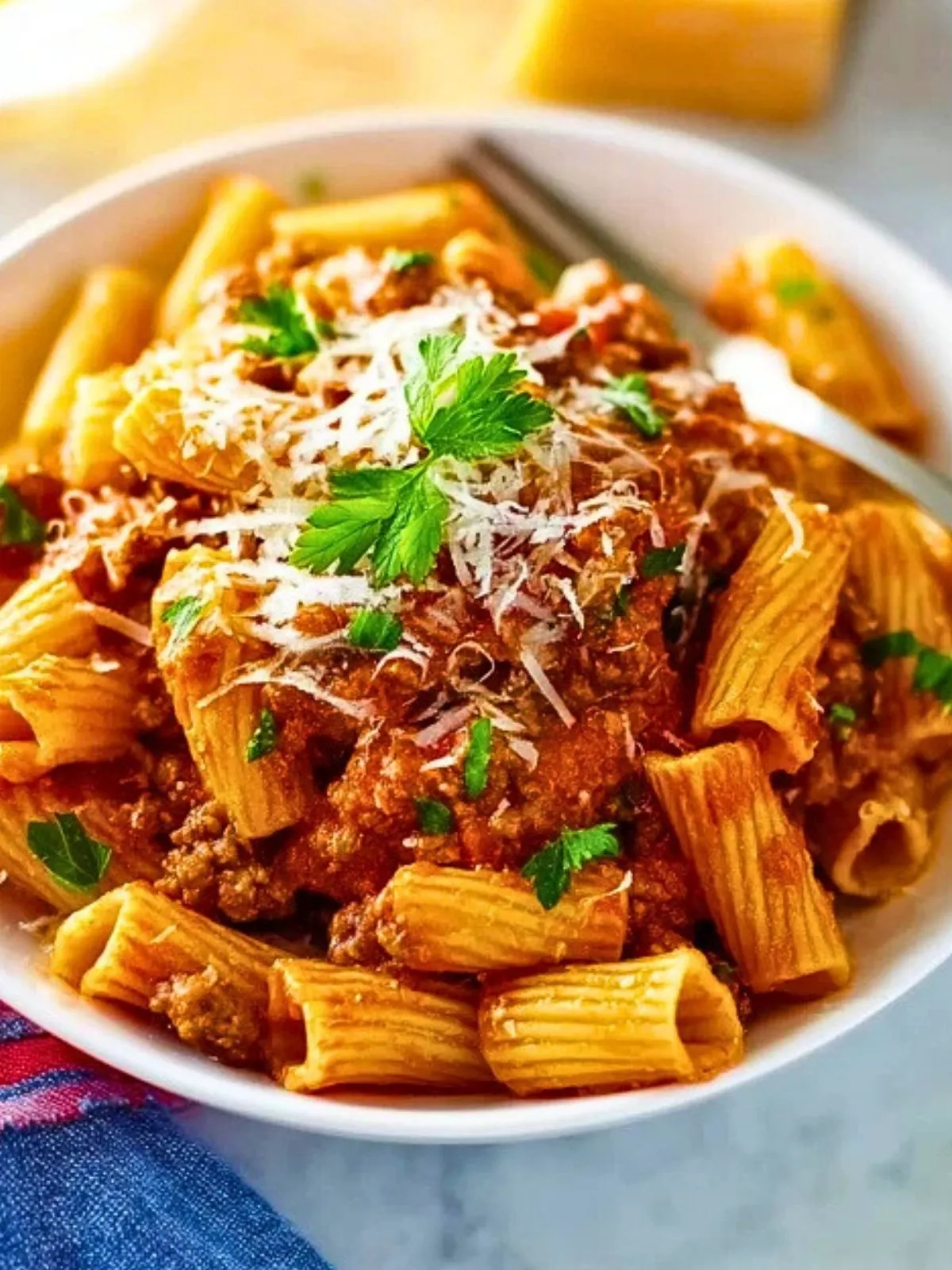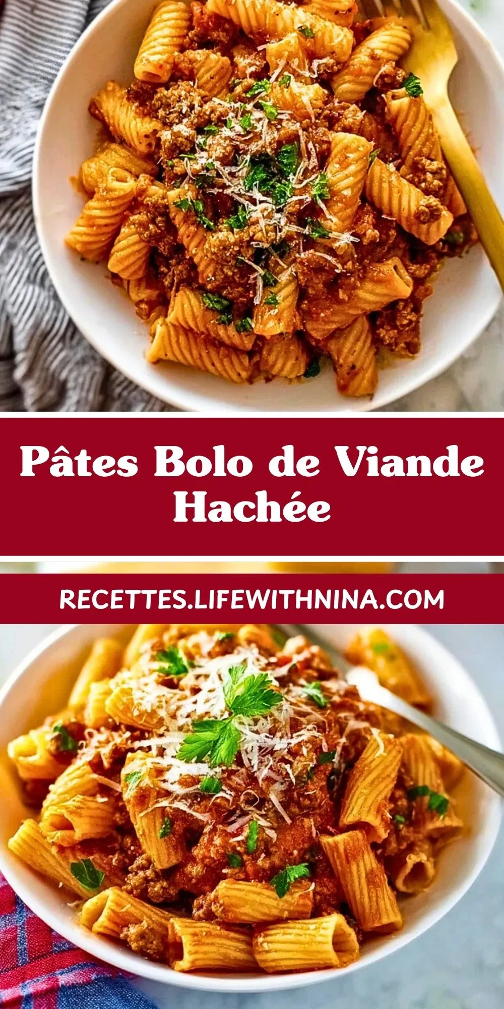 Ces pâtes bolo de viande hachée sont un plat complet, savoureux et réconfortant, préparé avec une sauce tomate mijotée, du bœuf haché bien assaisonné, des herbes aromatiques et des pâtes parfaitement enrobées.