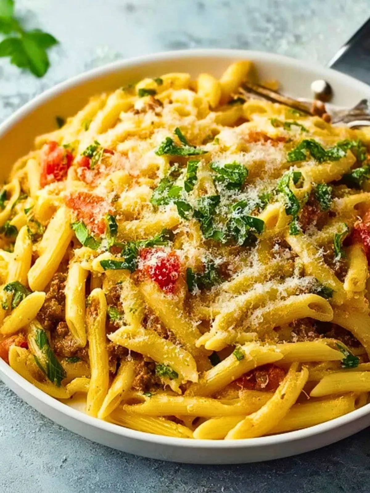 Ces pâtes confortables simples sont un plat rapide et généreux, composé de pâtes tendres, de viande hachée, de tomates cerises, d’épinards fondants et d’une sauce crémeuse au fromage. Faciles à préparer et très réconfortantes, elles sont parfaites pour un dîner de semaine savoureux, complet et sans complication.