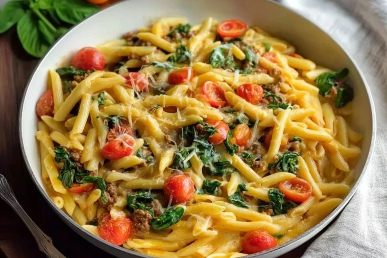Les pâtes confortables simples sont exactement le type de plat que l’on aime préparer quand on veut quelque chose de rapide, généreux et profondément réconfortant. Entre les pâtes tendres, la sauce crémeuse, les touches de tomates et les feuilles d’épinards fondantes, chaque bouchée donne l’impression d’un repas maison facile mais plein de douceur.