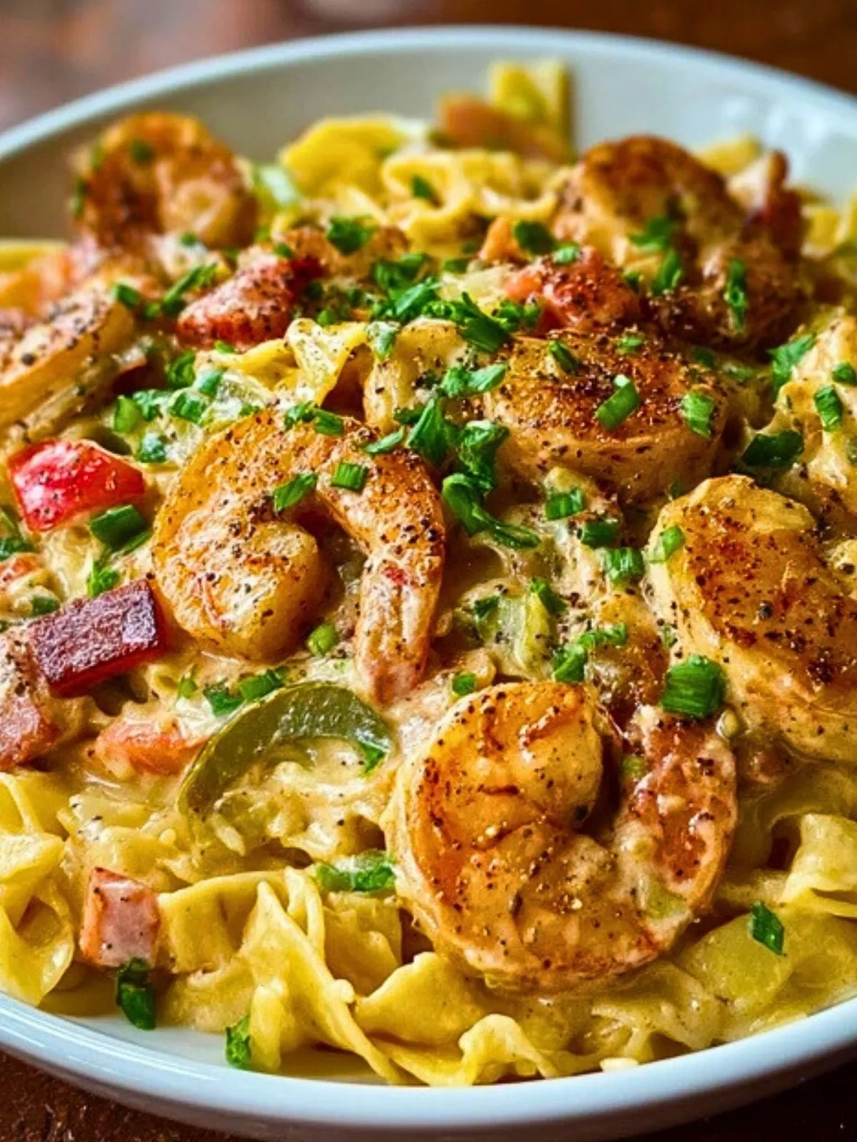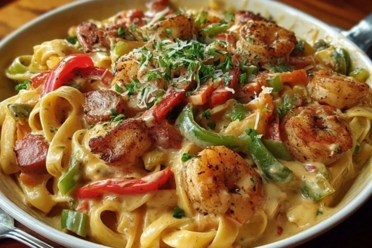 Des pâtes festives et ultra-crémeuses, riches en crevettes, andouille fumée, poivrons colorés et une sauce cajun onctueuse. Un plat convivial et généreux inspiré de la cuisine du Sud des États-Unis, parfait pour une soirée gourmande ou un repas familial qui met de la couleur à table.