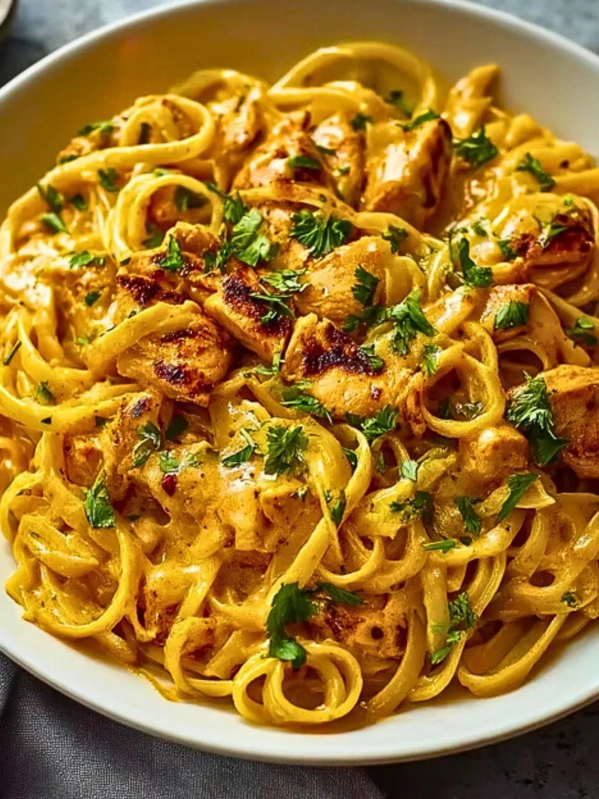 Ajoutez les morceaux de poulet dorés dans les pâtes. Mélangez pour bien enrober le tout de sauce. Parsemez du reste de persil et rectifiez l’assaisonnement si besoin. Servez chaud !
