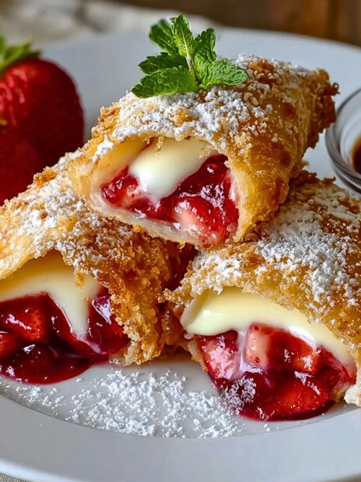 Des rouleaux dorés, ultra croustillants à l’extérieur, avec un cœur coulant de fromage frais vanillé et de fraises fondantes… ces pâtisseries frites au fromage frais et fraises ont tout du dessert réconfortant qui fait chavirer les gourmands. Servies encore tièdes, poudrées de sucre glace, elles rappellent à la fois les beignets de fête foraine et les pâtisseries orientales croustillantes.