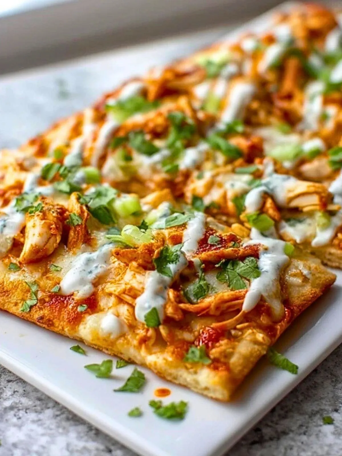 La Pizza Plat Pain de Poulet Buffalo Épicé est une version rapide et ultra gourmande de la pizza classique : on remplace la pâte par un pain plat (type naan ou pain pita épais), que l’on garnit de sauce tomate, de mozzarella et de poulet effiloché relevé à la sauce Buffalo. Le tout est gratiné au four puis fini avec une sauce fraîche à la crème, des dés d’oignon rouge et des herbes, pour un contraste parfait entre le piquant, le fondant et le croquant.