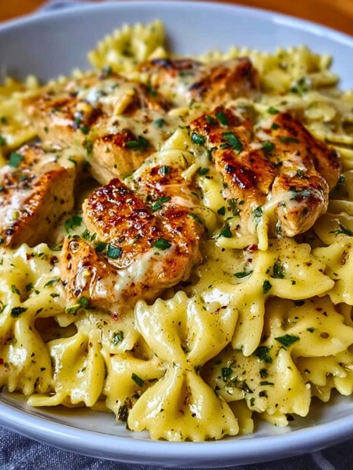 Un plat réconfortant mêlant le poulet tendre, la mozzarella fondante et une sauce crémeuse au parmesan, enrobant des farfalles parfaitement al dente. L’ail et le persil viennent relever l’ensemble pour un dîner convivial, facile et savoureux.