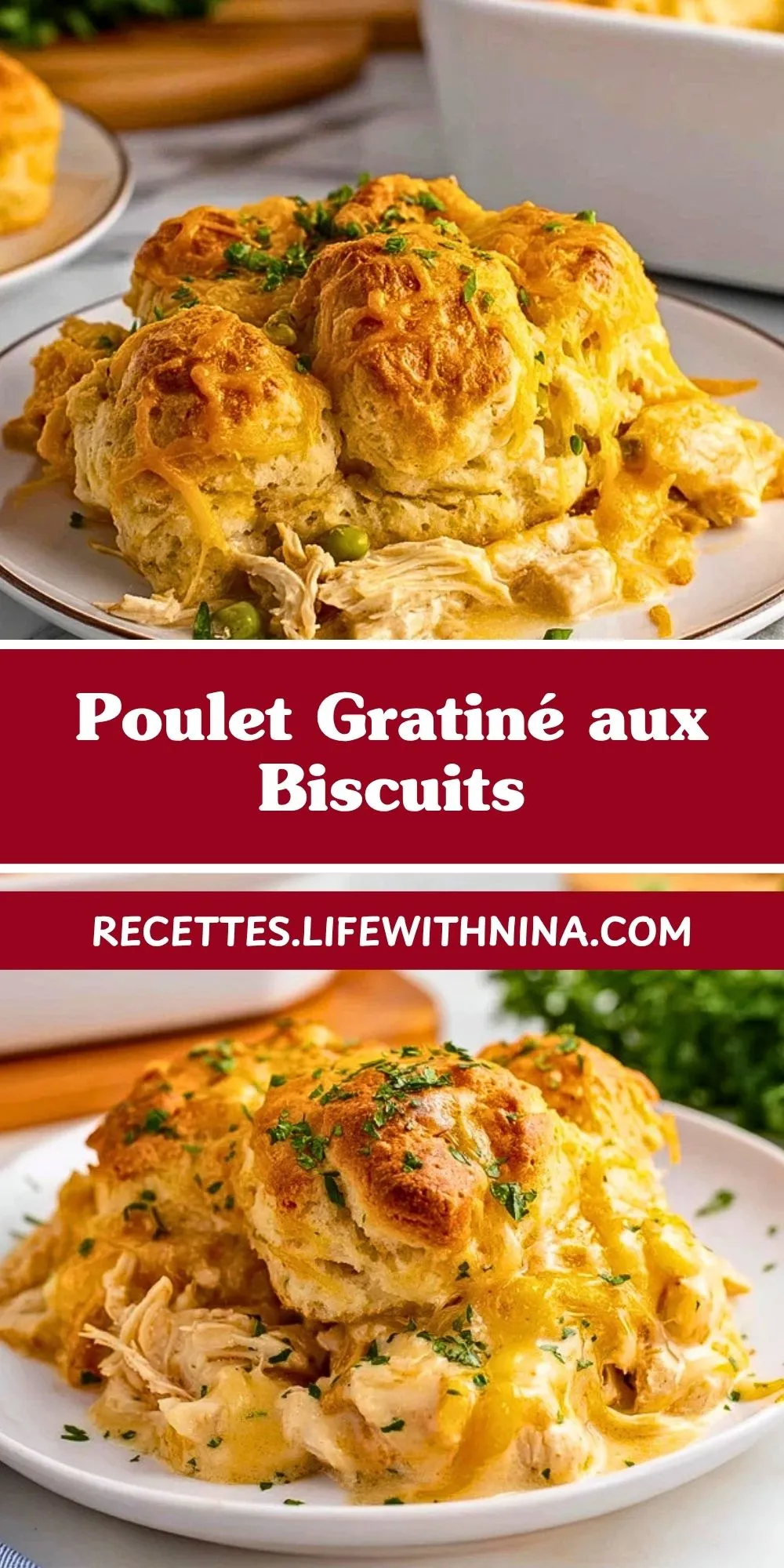 Le poulet gratiné aux biscuits est un plat familial généreux, réconfortant et incroyablement simple à préparer. Entre le moelleux du poulet effiloché, l’onctuosité de la sauce crémeuse, le fromage bien fondu et la couche dorée de biscuits, chaque bouchée offre un mélange de textures qui fait immédiatement penser à un dîner chaleureux partagé à table.