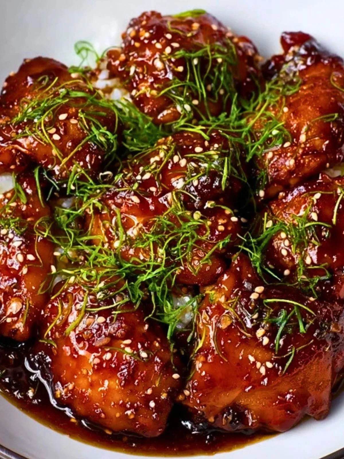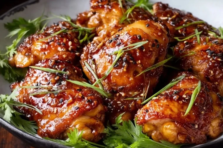 Arrosez généreusement les morceaux de poulet avec la sauce épaissie. Goûtez et ajustez au besoin avec un peu de poivre. Juste avant de servir, parsemez d’oignons nouveaux émincés et de graines de sésame pour apporter fraîcheur et contraste.