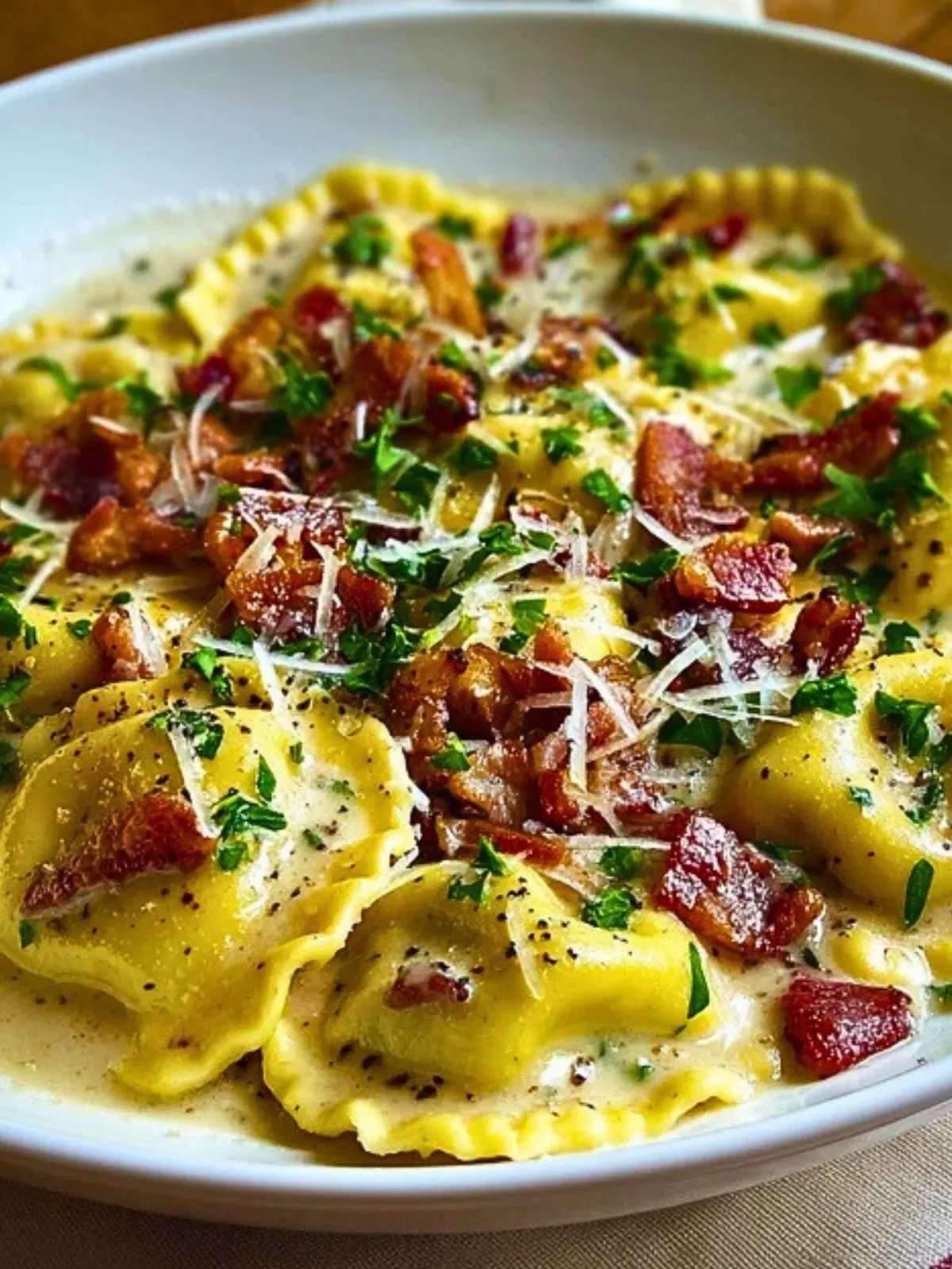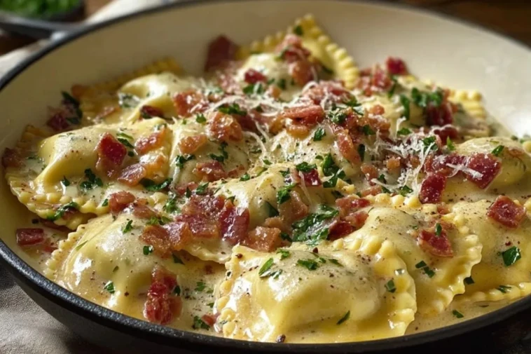 Une recette rapide et gourmande de raviolis nappés d’une sauce carbonara crémeuse, agrémentés de lardons croustillants et de parmesan. Parfait pour un repas réconfortant en semaine ou pour épater vos invités sans stress !