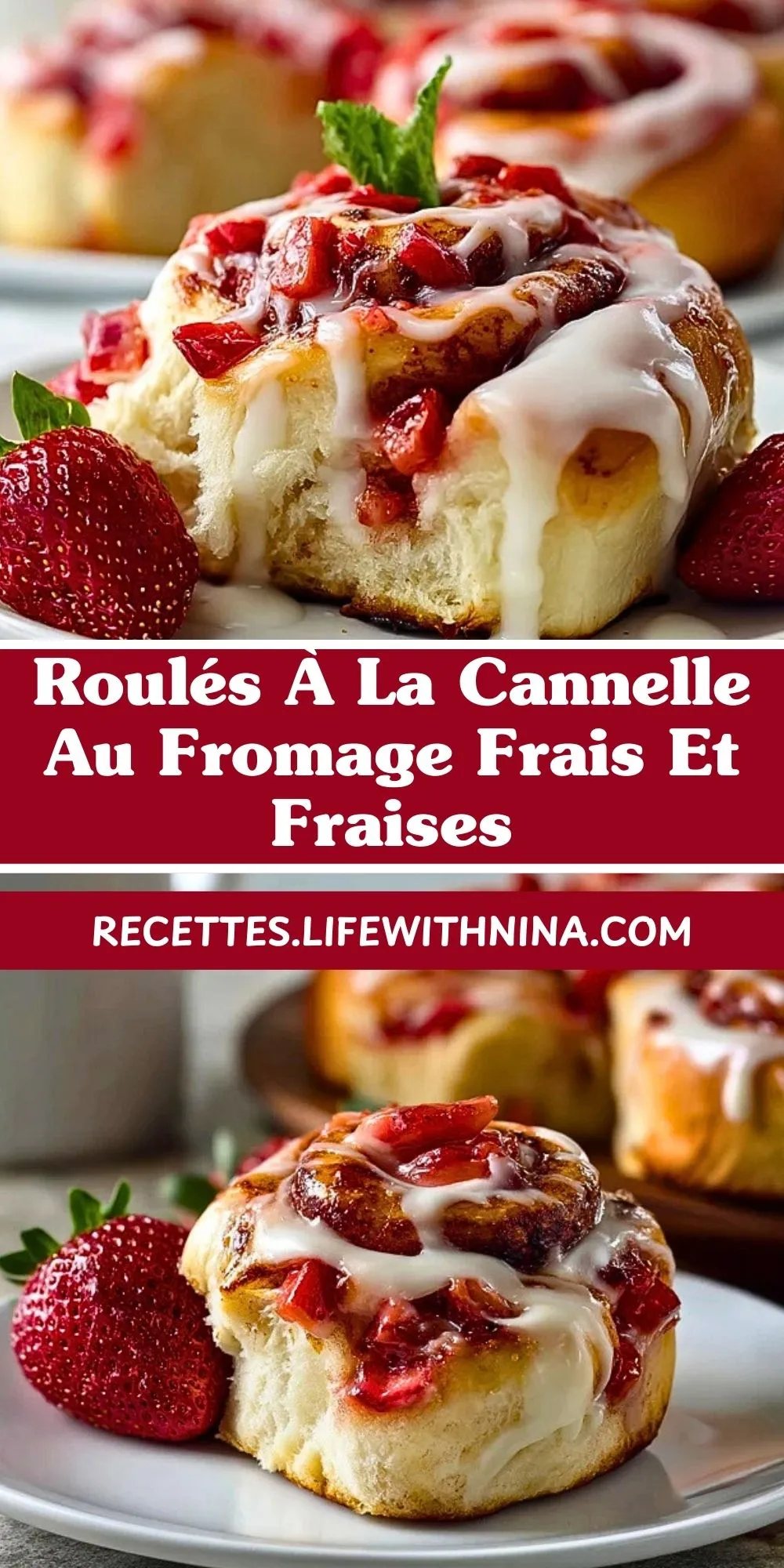 Ces roulés à la cannelle au fromage frais et fraises sont de moelleuses brioches spiralées garnies d’une crème au fromage frais légèrement citronnée, de morceaux de fraises fondants et d’un glaçage vanillé pour un petit-déjeuner ou un brunch ultra gourmand.
