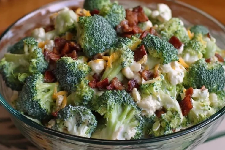 La salade de brocoli Amish est une recette fraîche et croquante, typique des grandes tablées de famille ou des pique-niques. Composée de fleurettes de brocoli cru, de lardons croustillants, de fromage râpé et de raisins secs, elle est liée par une sauce crémeuse légèrement sucrée, véritable signature de la cuisine Amish. C’est une salade aussi généreuse que gourmande, parfaite pour accompagner viandes grillées ou pour un buffet estival.