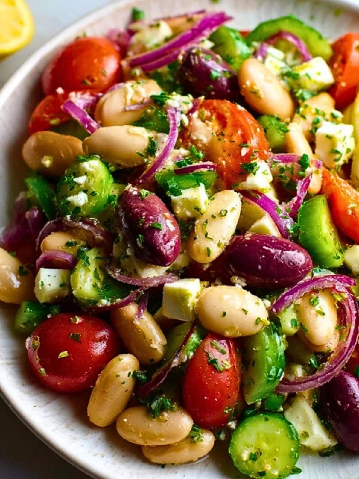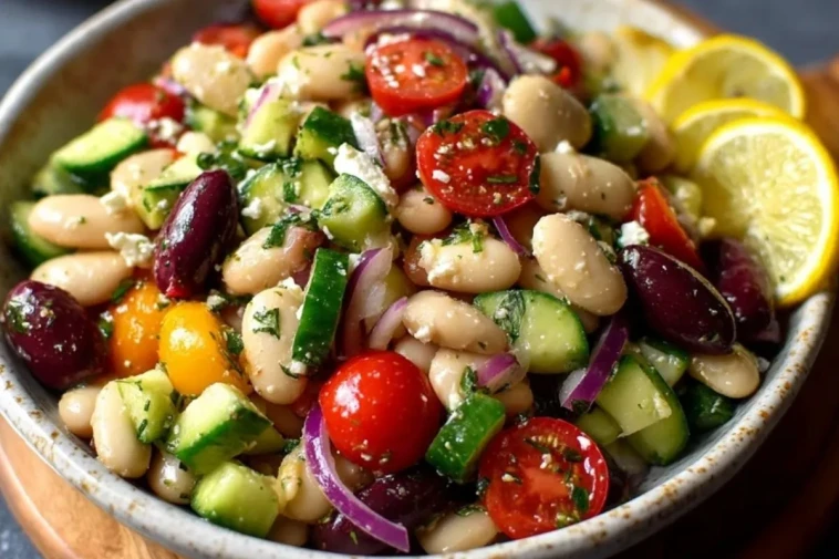 Keywords: salade grecque de haricots, salade méditerranéenne, haricots blancs, feta, recette saine, salade d’été