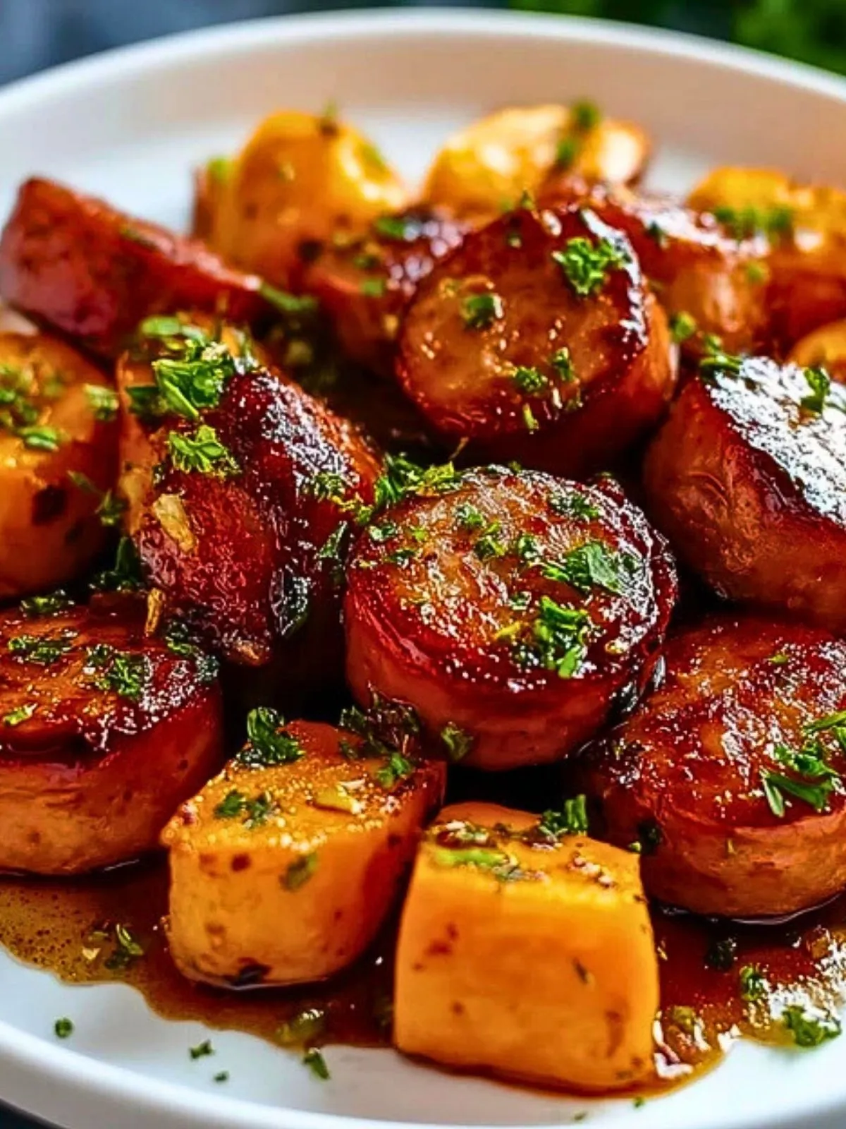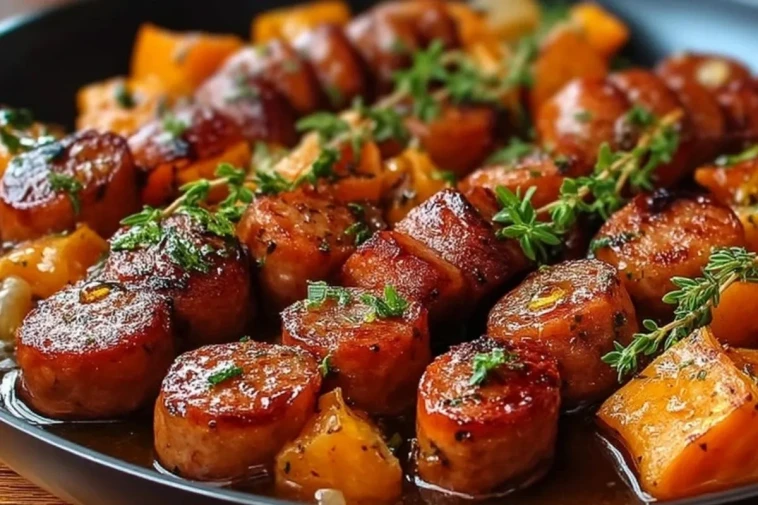 Keywords: saucisses, patates douces, miel, plat familial, comfort food