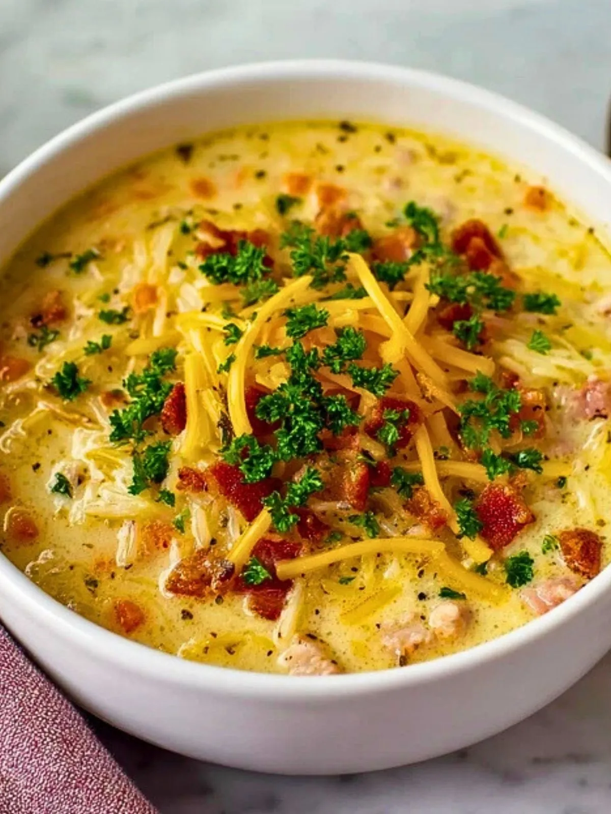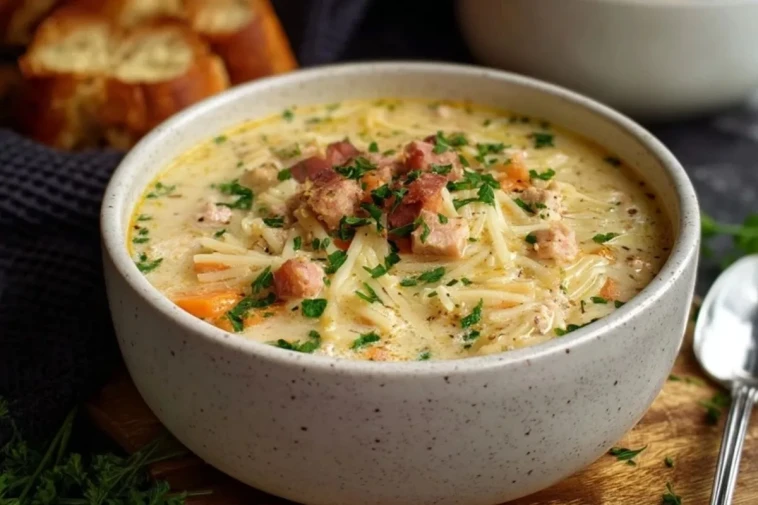 Cette soupe crémeuse au poulet et bacon est le genre de plat réconfortant que l’on aime retrouver quand on veut quelque chose de généreux, simple et profondément savoureux. Entre le poulet tendre, le bacon légèrement croustillant, le bouillon parfumé et la texture veloutée de l’ensemble, chaque cuillerée apporte une sensation de chaleur immédiate et un vrai plaisir de dégustation.