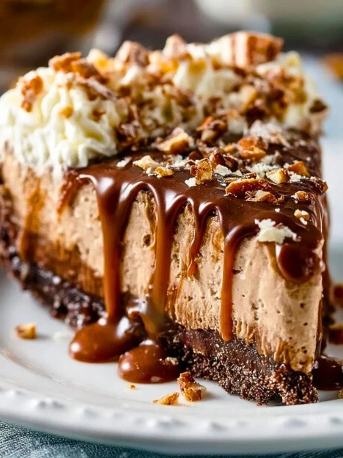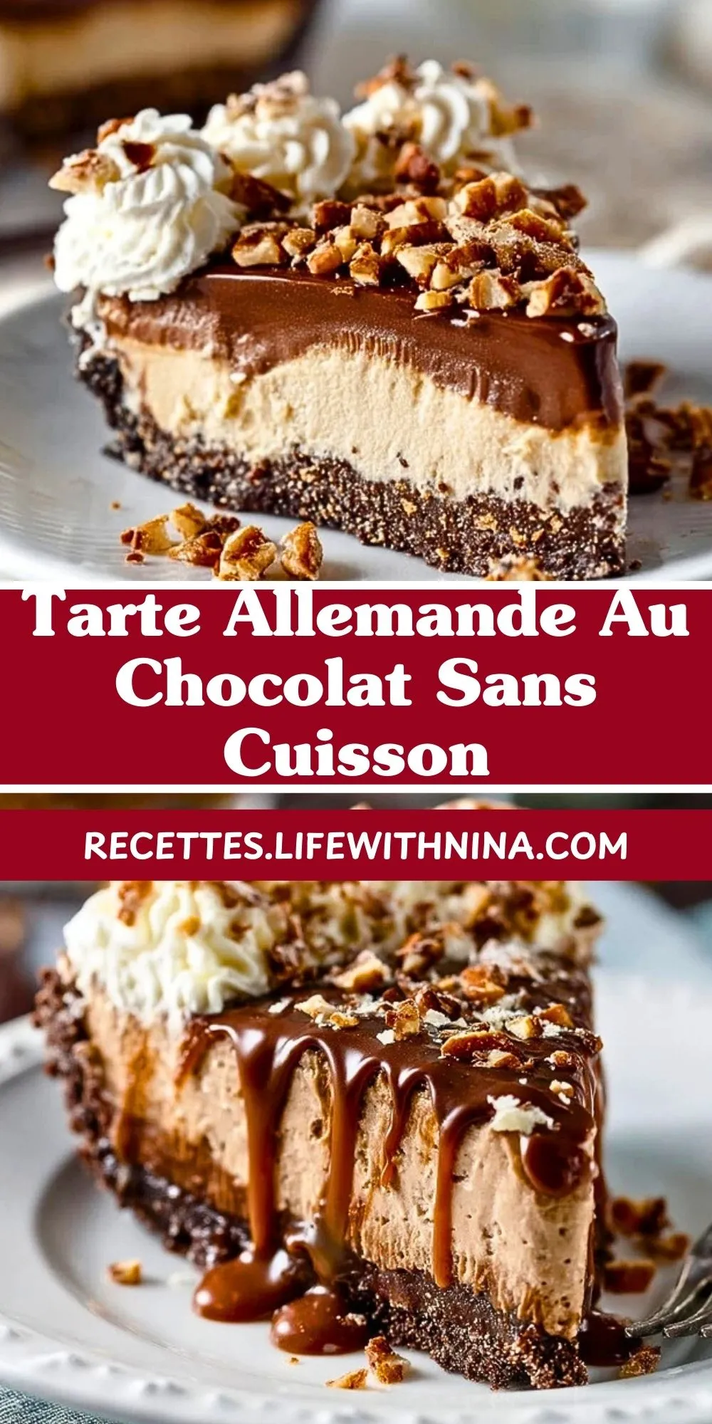Tarte allemande au chocolat sans cuisson : une base biscuitée croustillante, une mousse chocolatée légère, des noix croquantes et un nappage fondant, le tout décoré de chantilly. Parfait pour un dessert raffiné, facile et gourmand sans allumer le four !