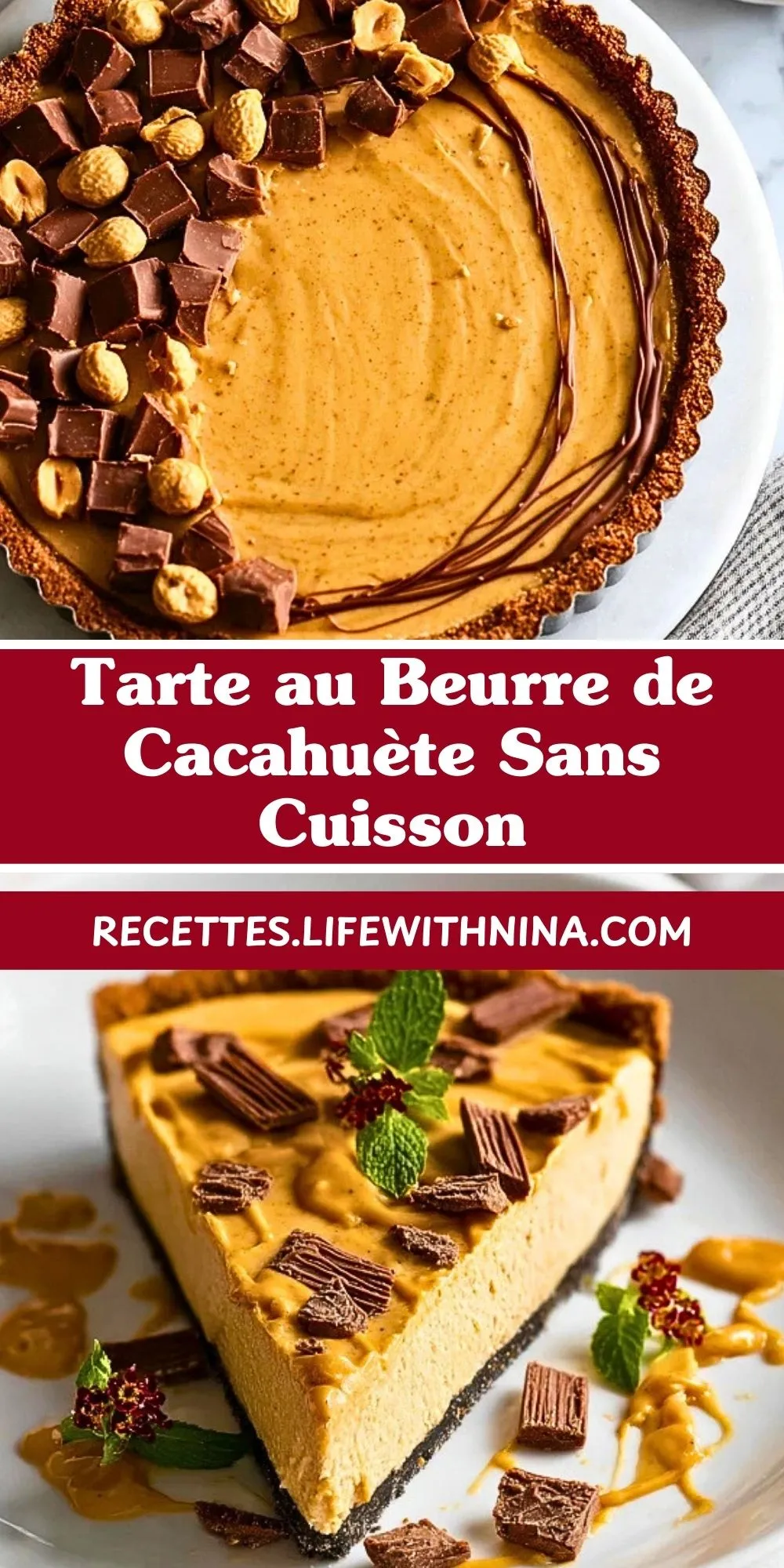 Une tarte ultra gourmande, sans cuisson, alliant une base croustillante de biscuits, une garniture fondante au beurre de cacahuète et une ganache au chocolat, pour un dessert rapide, original et irrésistible.