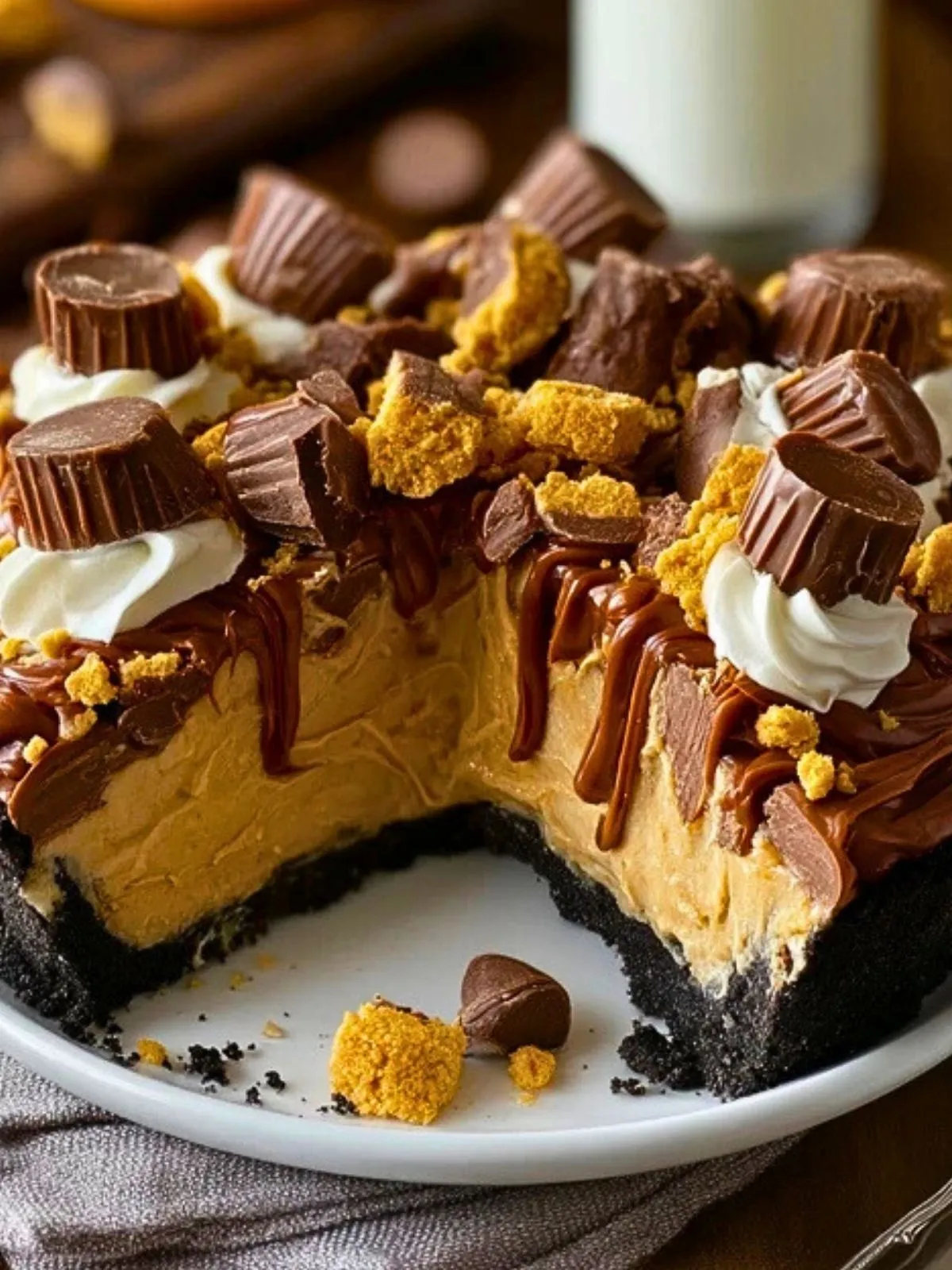 Cette tarte doit son côté irrésistible à l’équilibre entre croquant et fondant : la base aux biscuits cacao rappelle les célèbres sandwichs cookies, la garniture au beurre de cacahuète est douce et aérienne grâce au fromage frais et à la crème fouettée, tandis que la ganache au chocolat apporte une finition lisse et intense. Le tout, surmonté de morceaux de bonbons au beurre de cacahuète, crée un dessert ultra gourmand sans nécessiter de techniques compliquées.