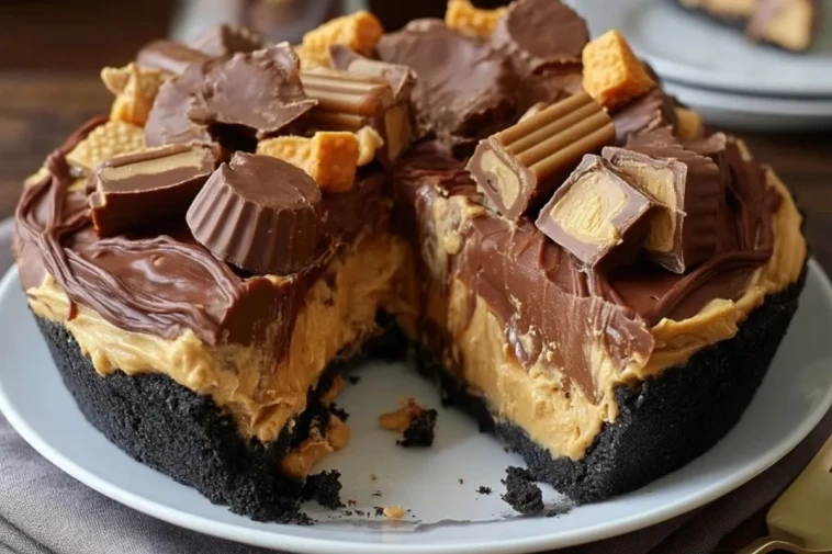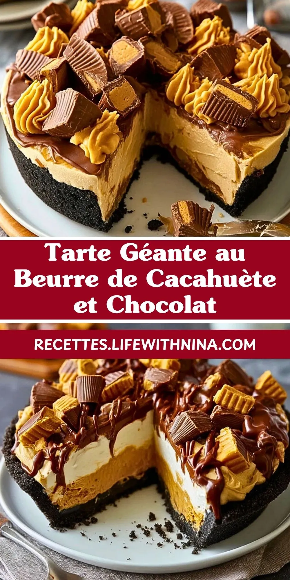 Cette tarte géante au beurre de cacahuète et chocolat associe une croûte biscuitée au cacao croustillante, une garniture crémeuse au beurre de cacahuète et fromage frais, et une couche généreuse de ganache au chocolat, le tout surmonté de bonbons au beurre de cacahuète pour un dessert ultra gourmand et spectaculaire sans cuisson compliquée.