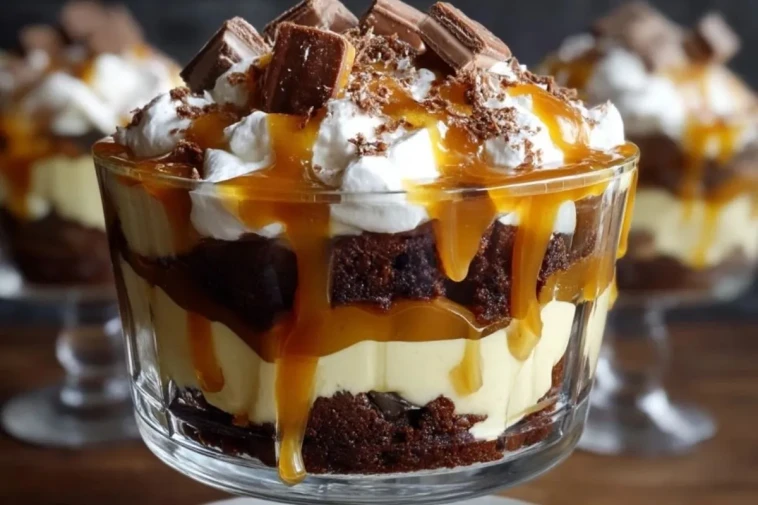 Le trifle au brownie et caramel est une version moderne du trifle anglais traditionnel. Au lieu d’utiliser un simple gâteau ou des biscuits, on y intègre des cubes de brownie au chocolat, qui apportent une texture dense et fondante. Ces morceaux sont alternés avec une crème vanillée façon mousse mascarpone, de la sauce caramel au beurre salé et de la chantilly. Le résultat est un dessert en couches, servi dans un grand saladier en verre ou en verrines individuelles, où l’on voit clairement toutes les strates gourmandes.